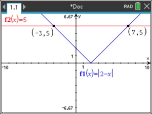 nSolve ( | 2 - x | = 5, x, 0, 10 ) for a positive solution.